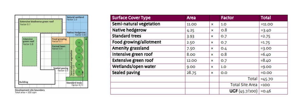 The score is calculated using a set of weighted green infrastructure surface cover types that include natural and semi-natural vegetation, street trees, hedgerows, sustainable drainage features, green roofs and walls. The area of each surface cover type is multiplied by a weighting, and the sum of these figures is divided by the total area, using the Excel spreadsheet provided.